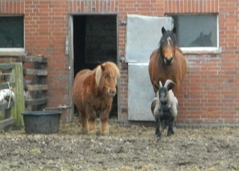 Saturday was misty and miserable, but our boys still enjoyed their romp in the paddock, while we mucked their stables. On our afternoon cycle we saw quite a cute sight, a horse, a goat and a Shetland pony standing together outside their stable – we had to take a picture, they were posing so well.